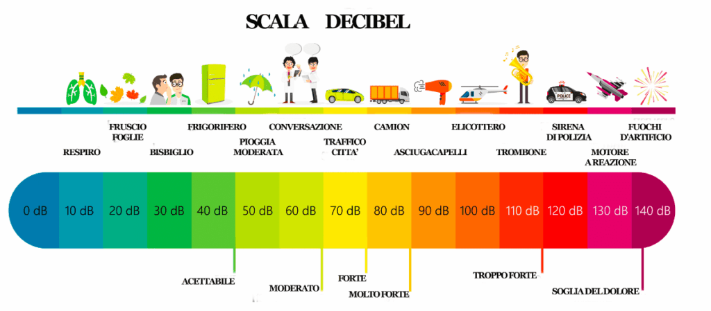 60 dB si possono trovare in un ufficio o in un ristorante e 65 dB è la soglia di sicurezza sopra la quale iniziano i disturbi per la salute. Passato questo limite, il rumore altera le funzioni dei sistemi neuro regolatori. Gli effetti dannosi includono: